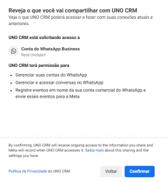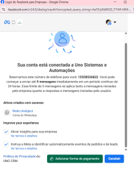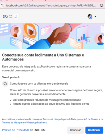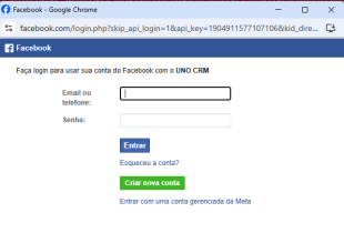 Após criada a conexão uma janela direcionando ao facebook para realizar a conexão será aberta, para que seja realizado o login do perfil vinculado a um gerenciador no Meta.