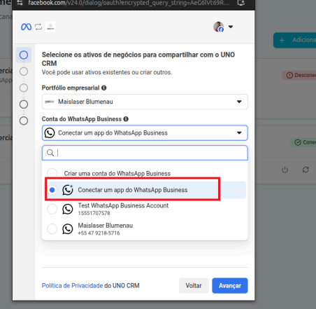 Após isso, Selecione o Portfólio empresarial, e caso não possua uma conta de Whatsapp Business selecione a opção Criar uma conta do Whatsapp Business.